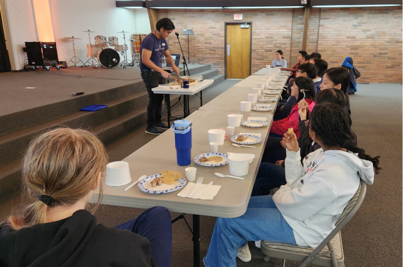 To enhance the experience, Middle School Bible teacher Jon Kok served students hot lamb and other themed foods while they watched each video—giving them a multisensory taste of a traditional Jewish-style meal. Students enjoyed dishes such as lamb, unleavened bread, honey, grape juice, fresh fruit, and soup, making the historical content feel tangible and memorable.